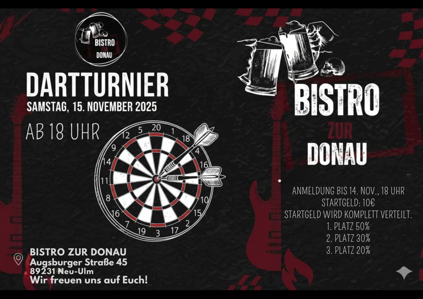 ANMELDESCHLUSS ist der 14.11.2025 um 18 Uhr. Anmeldungen nur direkt im Bistro zur Donau, Augsburger Straße 45, 89231 Neu-Ulm