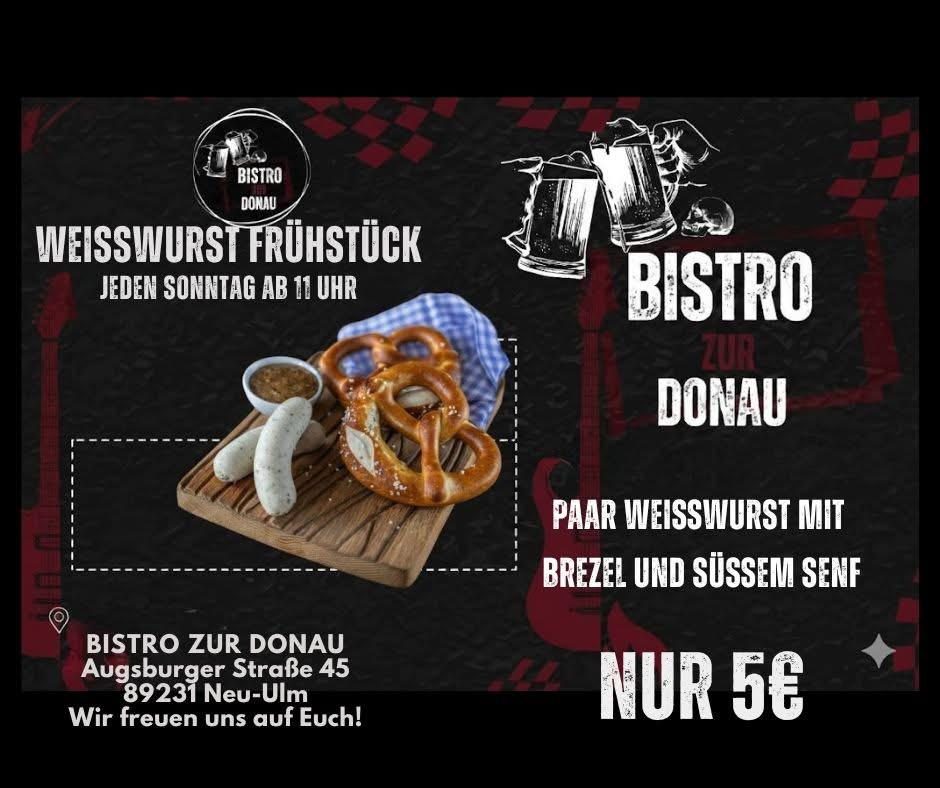 Jeden Sonntag ab 11:00 Uhr heißt es Frühstück auf bayrisch genießen im Bistro zur Donau. Für 5,00 € kannst Du Dir Dein paar Weißwurst mit süßem Senf und einer Brezel schmecken lassen.